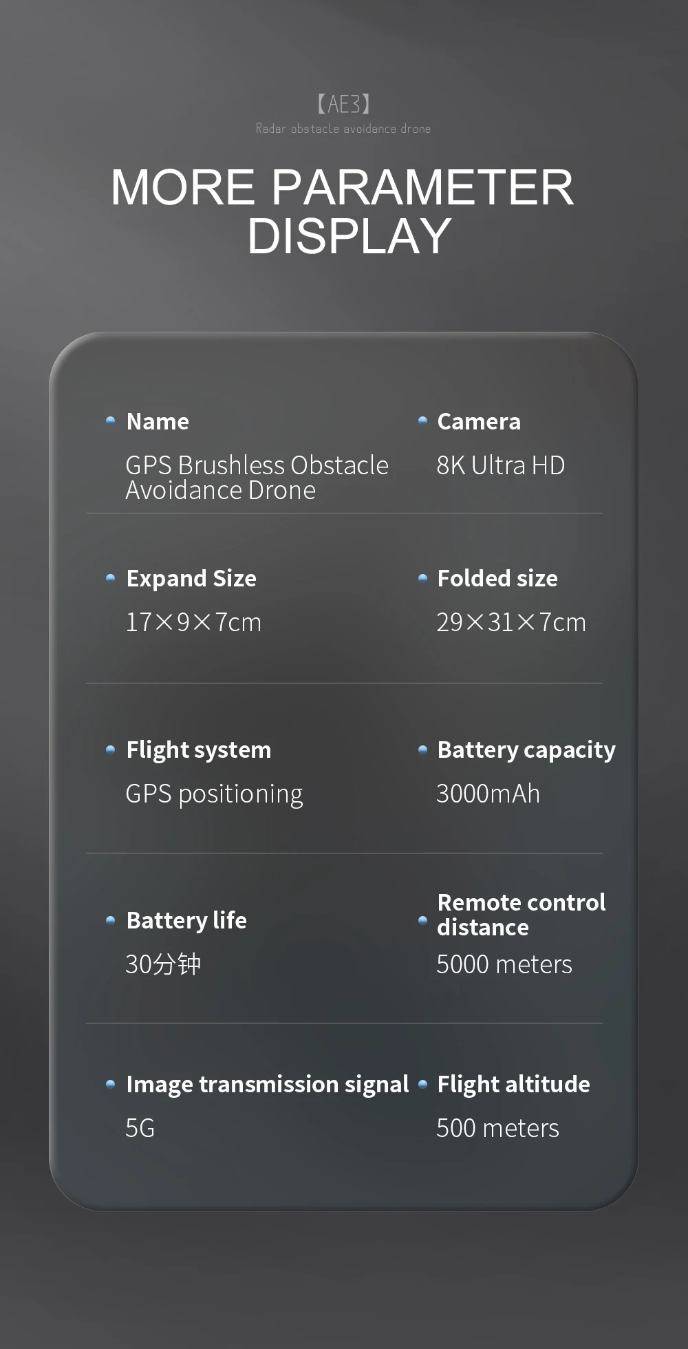 AE3 supports high-definition video and picture transmission up to 3 kilometers and has excellent anti-interference ability, allowing you to fly farther and see more clearly